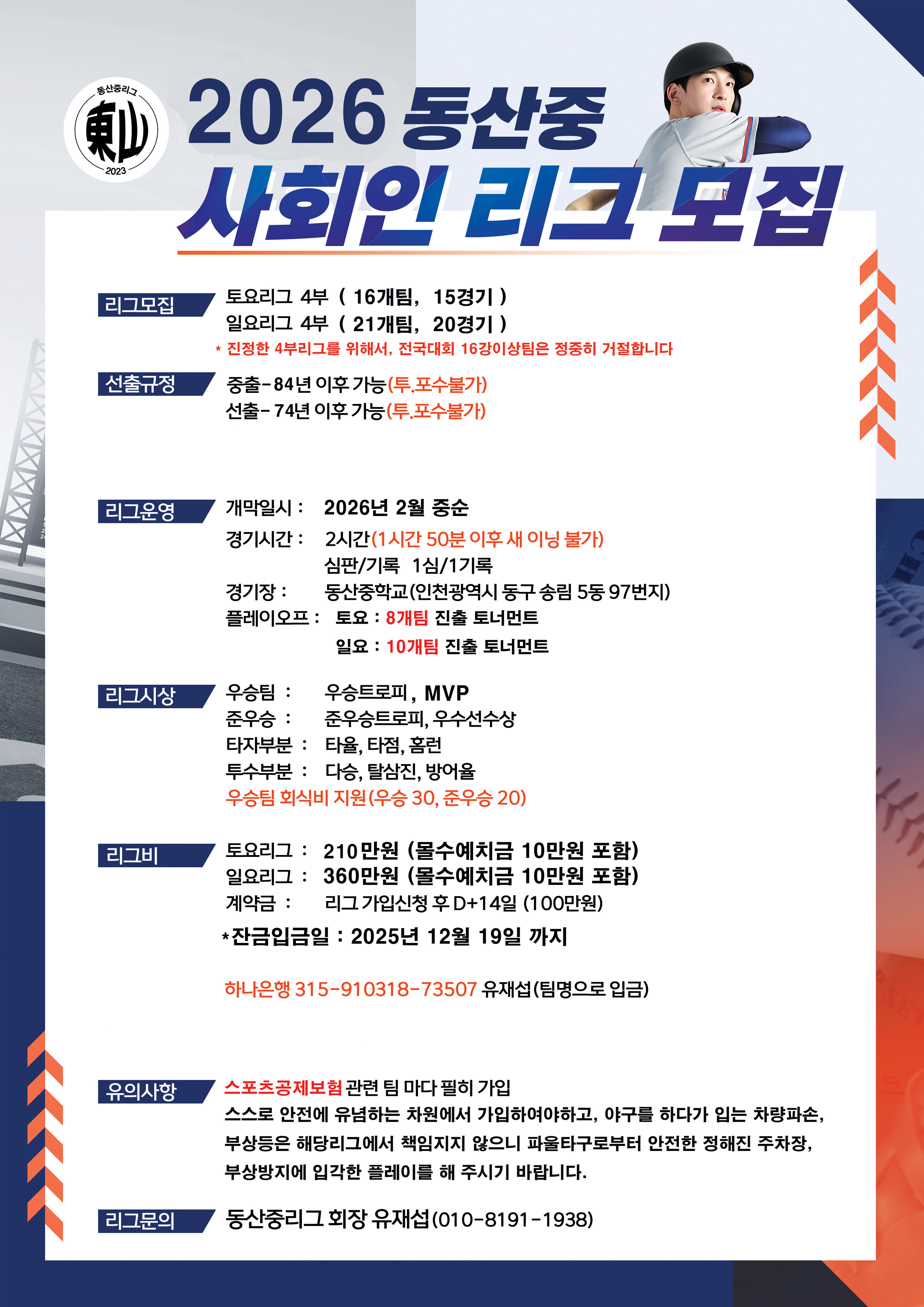 [서울,인천] 26년 동산중리 참가팀모집 ** 20경기 **