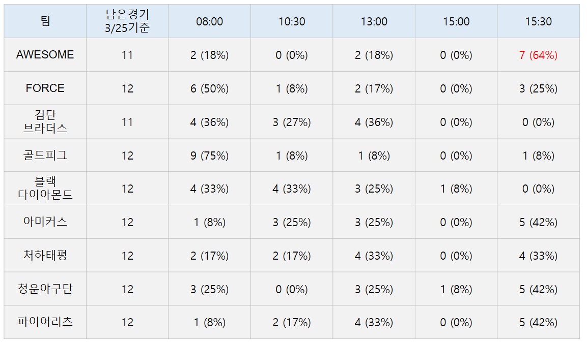 아래는 오늘기준 잔여경기 시간대별 점유율 입니다.